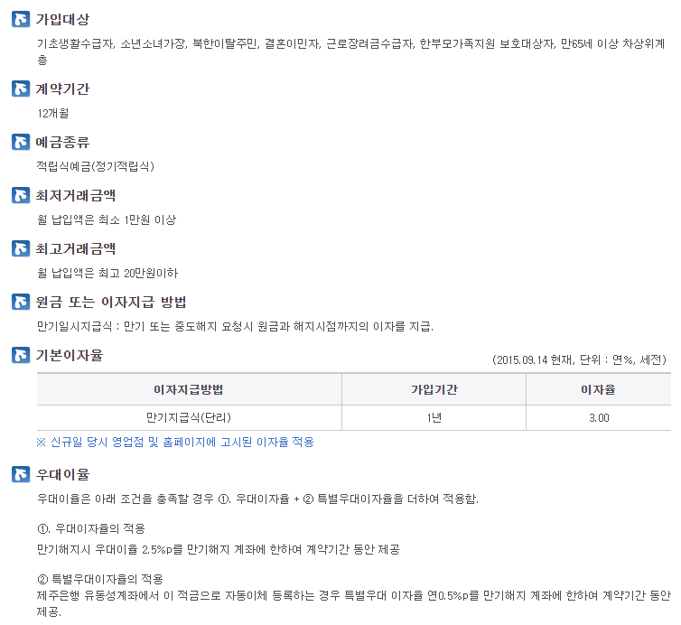 - 수령예상금액 : 월 20만원 납입시 원금 240만원 이자는 65,988원 (세금 15.4% 제외한 금액)