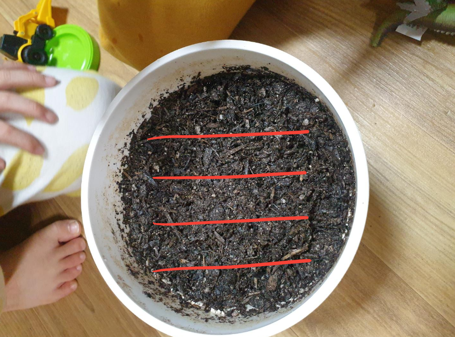 이런식으로 뭉태기로 씨앗을 심는다고도 하더라고요. 빨간 동그라미는 씨앗 부분, 파란 동그라미는 나중에 거름을 줄 부분 입니다. 거름은 뿌리에 닿아선 안되어서 따로 구역을 나눠 줬습니다.