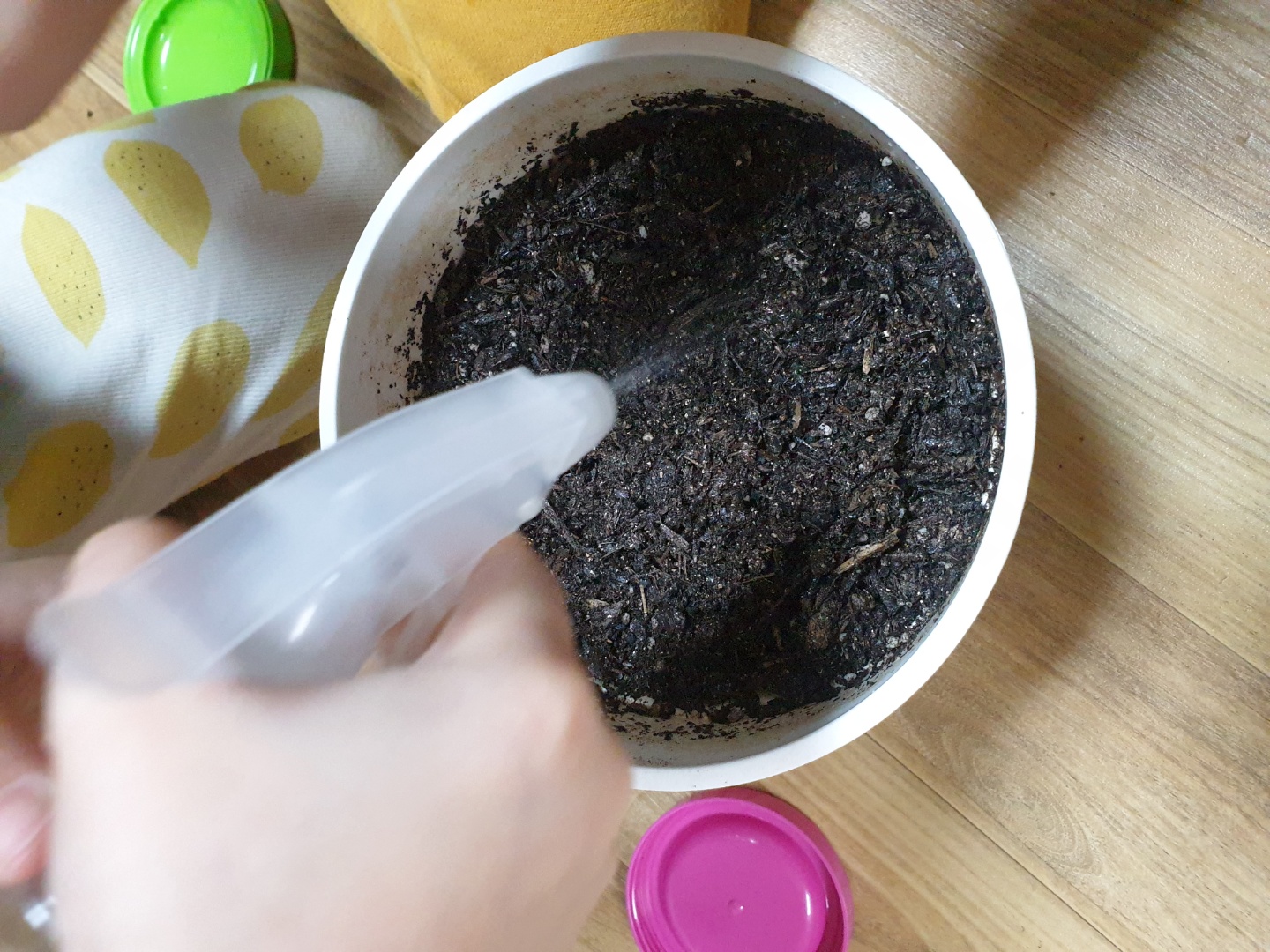 씨앗을 심을때는 상토가 좋다던데, 집에 남아있던건 배양토라 그냥 배양토에 심었습니다. 예민하지 않은 채소라 상관 없을 것 같아서요😊💦 먼저 흙에 물을 적셔 줍니다.
