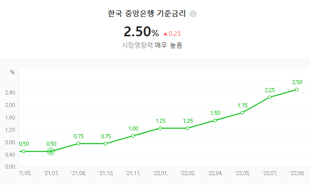 때문에 우리나라도 계속해서 기준금리를 올리면서 현재 2.5%까지 올렸습니다